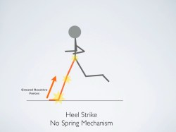 This is without doubt is significantly different from heel striking with an extended leg. When studies demonstrate elite runners as being heel strikers, this is typically how they are “heel striking”. The leg and foot are landing below the center of gravity of the body with the knee bent allowing for the “spring mechanism” to be elicited. It is impossible to determine whether or not the heel is truly striking first because of the shoe gear. The small amount of cushion on the heel of the shoe places the foot at a slight angle which could mean the mid foot or forefoot is striking simultaneously with the heel of the shoe with the foot at an angle allowing recoil to occur in the cushioned heel. In other words the foot is landing flat in association with the shoe gear.