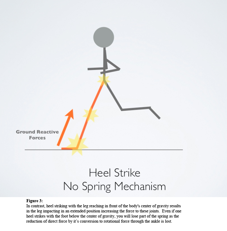 Figure 3 - In contrast, heel striking with the leg reaching in front of the body's center of gravity results in the leg impacting in an extended position, increasing the force to those joints. Even if one heel strikes with the foot below the center of gravity, you will lose part of the spring, as the reduction of direct force by its conversion to rotational force through the ankle is lost.